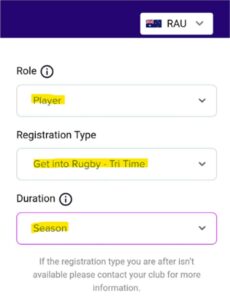 Note: For U5 – U7 Registration Type is ‘Get Into Rugby – Tri Time’